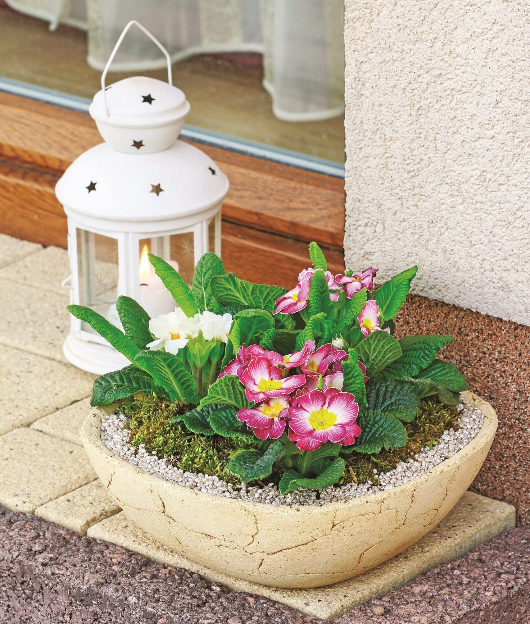 Podél okraje pak pomocí lžíce nasypejte dekorativní štěrk.Díky úpravě povrchu je z obyčejných primulek skutečná květinová dekorace.