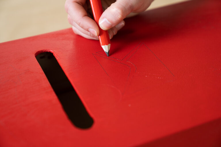 Krok číslo 3: Červenou barvu pečlivě promíchejte a schránku plochým štětcem ze všech stran ve dvou vrstvách natřete. Poté, co obě vrstvy nátěru důkladně zaschnou, načrtněte si vzor, kterým schránku budete chtít dozdobit.