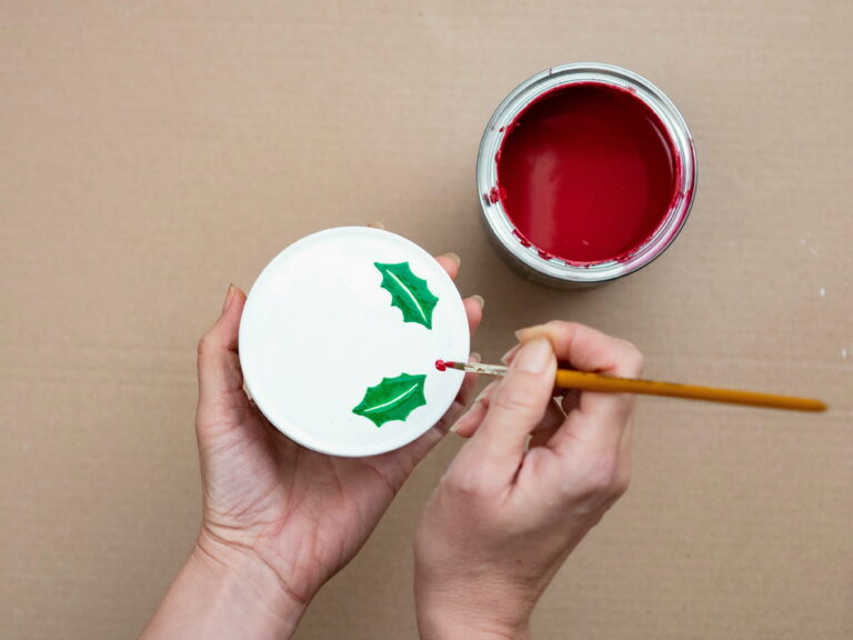 Krok číslo 2: Pak tenkým štětcem na víko namalujte vánoční vzor. Pomocí tmavě zeleného a červeného odstínu vytvořte třeba lístky cesmíny.