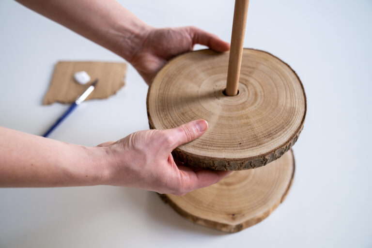 Krok číslo 5: Po zaschnutí nátěru zbývá už jen etažér sestavit. Na okraj tyče naneste lepidlo a vložte ji do otvoru uprostřed kulatiny s největším průměrem.